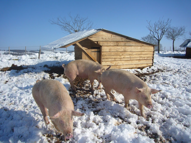 Petit album de photos pour illustrer ces premiers mois de travail... Mais quelles photos choisir? non pas que je sois une assidue de la caméra, mais j'essaie tout de même de penser à l'emporter parfois, histoire de croquer ici et là des images qui me touchent. Bien entendu, lorsque Mourjou est sous la neige... je ne résiste pas: nous avons eu un joli manteau blanc, une quinzaine de jours cet hiver, avec des cochons tout étonnés en sortant de leur cabane! Puis, comme des enfants, ils se sont mis à courir et jouer. Normal quoi...